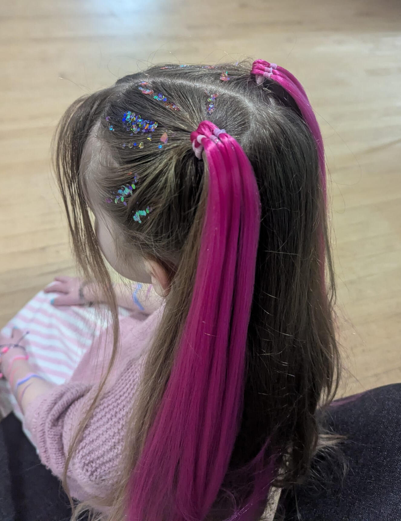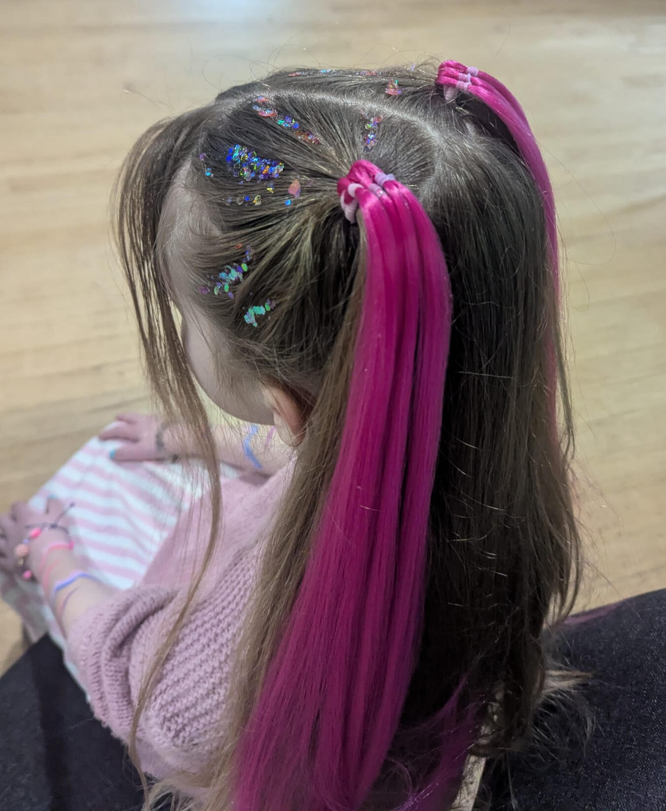 Tie in tinsel hair is the new way to make your hair sparkle with out the glitter getting everywhere. Perfect for a night out, special event or just because you can. you can add this on to your party package for some extra glam.